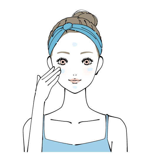 - ①手のひらにパール粒大2つ分くらいの大きさのACクリームを取り出し、額・両頬・顎・鼻等にお顔全体に塗布します。